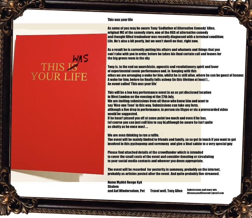 In August I organised a “woke wake” for my one time best friend and fellow comedian “God father of alternative comedy” Tony Allen .